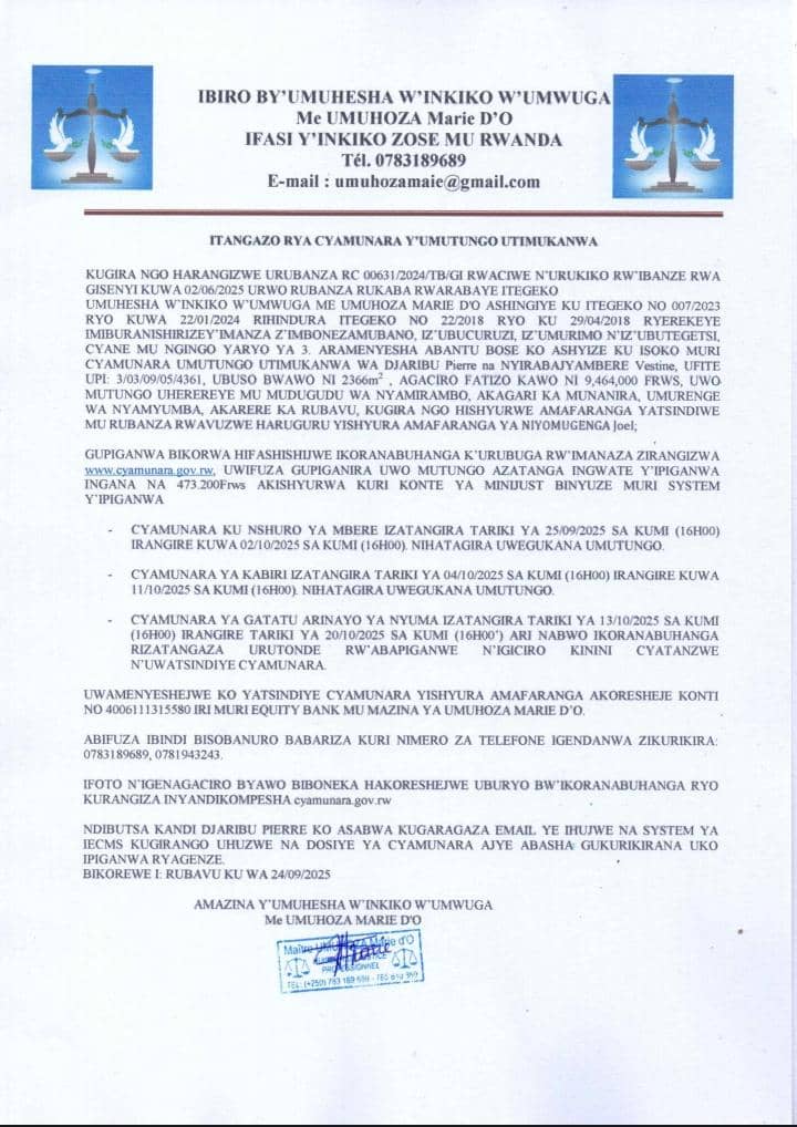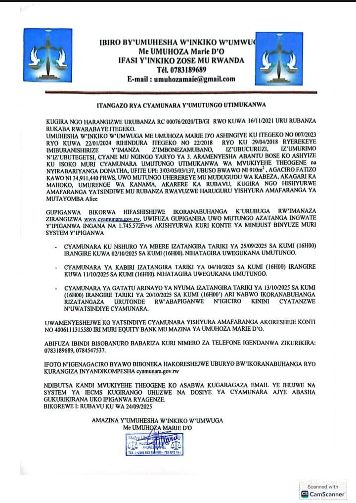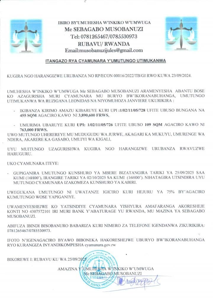 ITANGAZO RYA CYAMUNARA Y'IMITUNGO UTIMUKANWA UHEREREYE NDERA MURI KIGALI