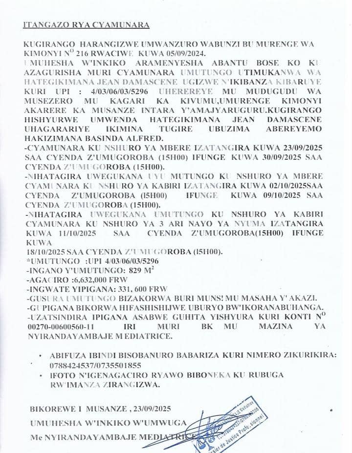 ITANGAZO RYA CYAMUNARA Y'UMUTUNGO UTIMUKANWA UHEREREREYE CYUVE MURI MUSANZE