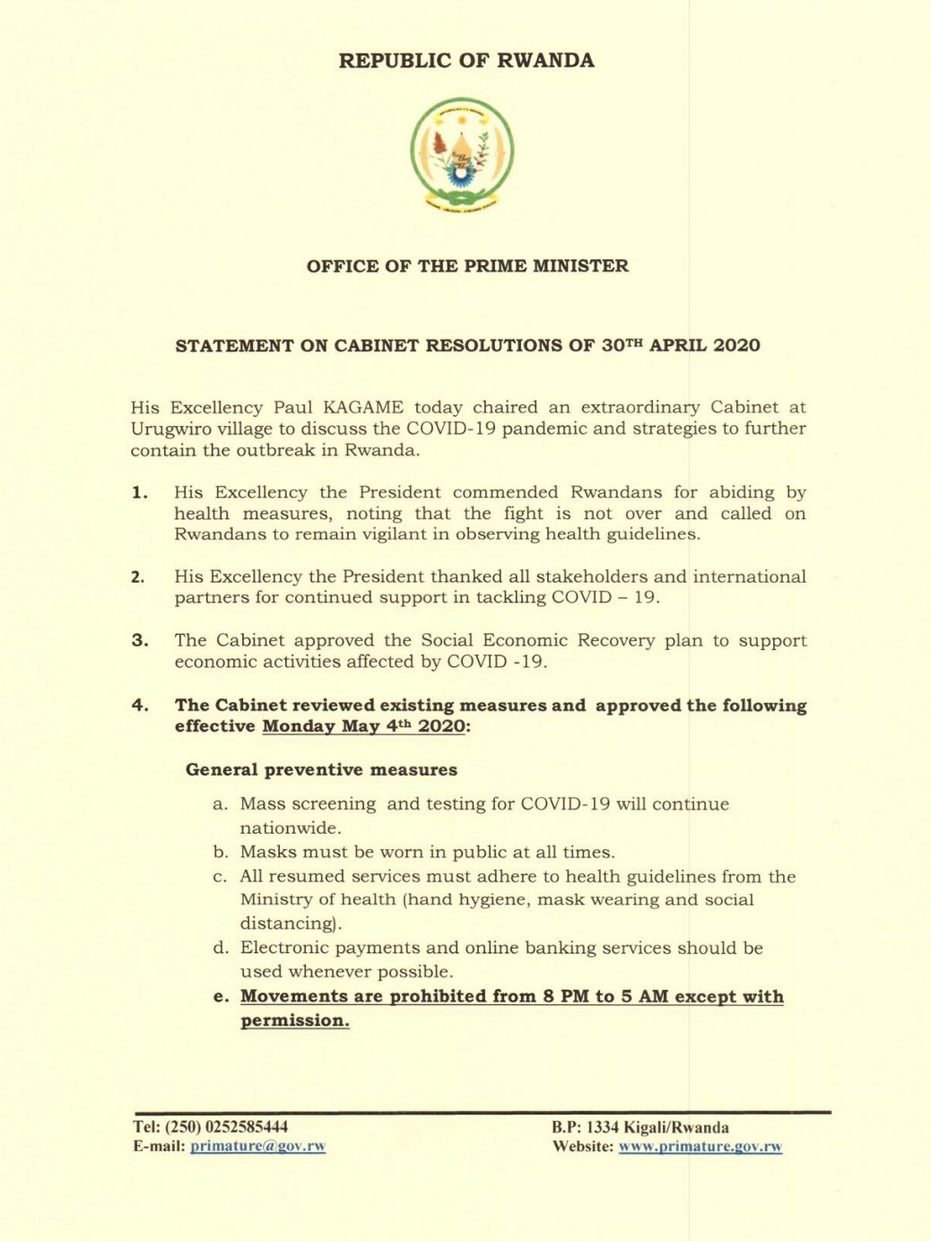Among the new strategies approved by the Cabinet, they are streamlining some activities and resuming operations while others are being delayed. A statement from Prime Minister Dr Edouard Ngirente said the new measures would "take effect on Monday, May 04 and last for two weeks."